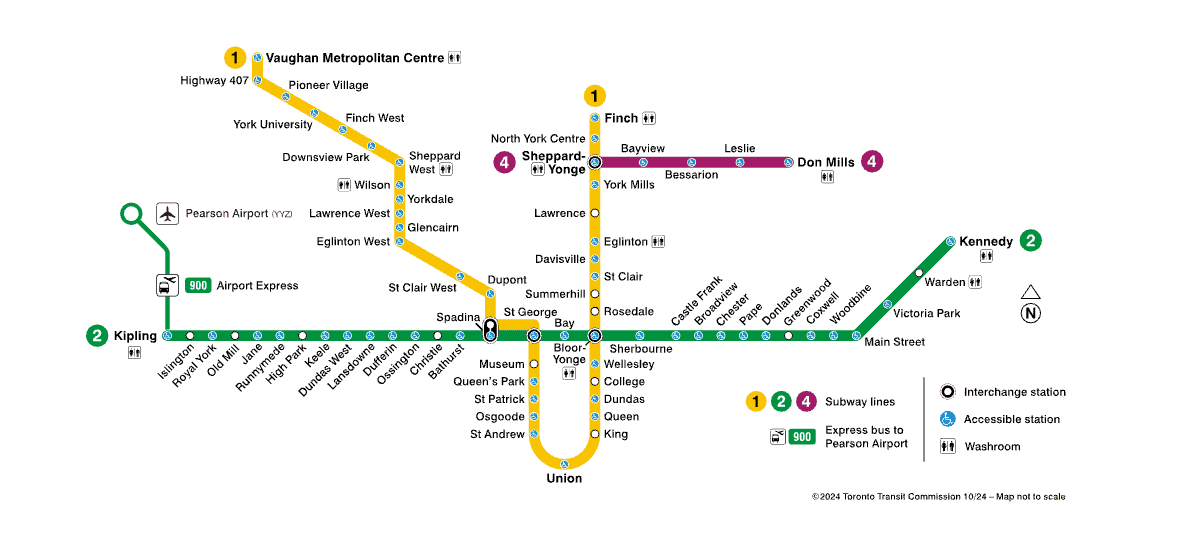 Line information: Yonge-University trains run every 2 to 3 minutes during the rush hours and every 4 to 5 minutes outside the rush hours.